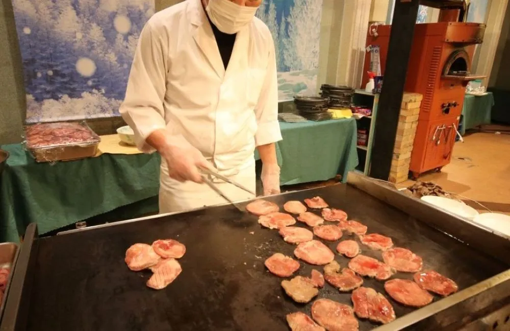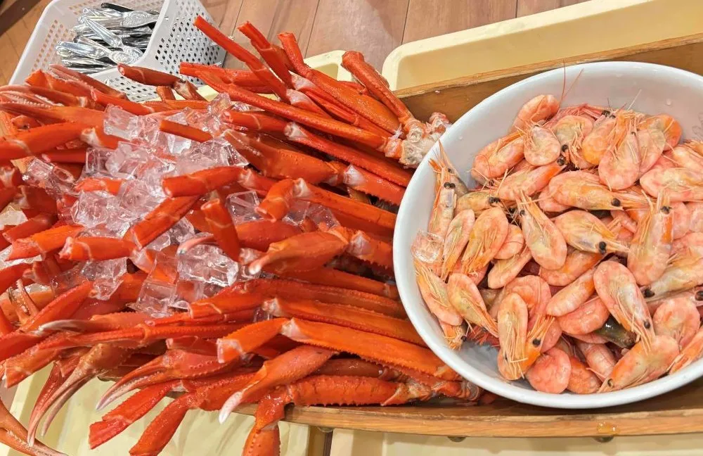 宿到着後はバイキングへ。名物の牛タンやカニを心ゆくまで堪能。